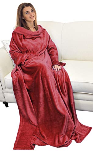 Katalonien stilig bärbar mysfilt med ärmar och ficka, mjuk mysig fleeceslankets för kvinnor fluffig plysch överkast vinter TV-filt för soffa 185 x 130 cm, vin