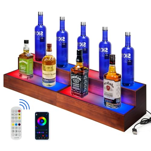 B4Life LED-upplyst displayhylla för sprit, 2 nivåer äkta träupplysta barhyllor för sprit, 32 tums hylla hem med fjärrkontroll och appkontroll (2-pack), brun