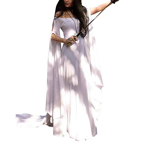 AnyuA Dam vintage renässans medeltida kostym klänning långärmad golvlängd cocktail, Vitt, M
