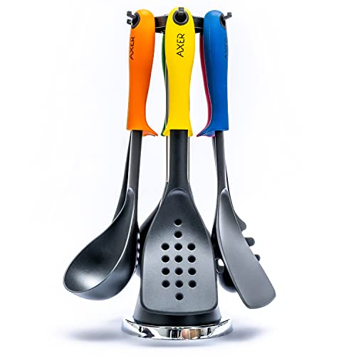 Axer Nylon matlagningsredskap med roterande stativ och upphöjt system - flerfärgad köksuppsättning med 6 matlagningsredskap - inklusive sked Skål Skummare Turner Spatel och pastaserver
