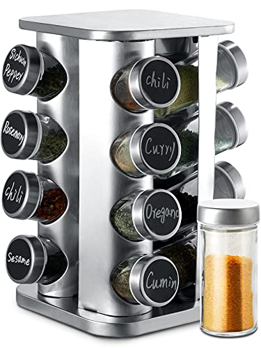 Miorkly kryddhylla, kryddkarusell med 20 kryddburkar, 360° roterbart kryddställ i rostfritt stål, kryddburkar med ströinsats, kryddbehållare i rostfritt stål, kryddburkar, rund kryddströare